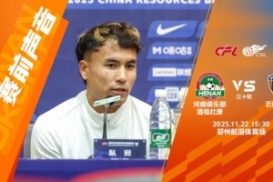 “大家下午好,明天的比赛是我们俱乐部在中超联赛第一年的收官战,作为一支升班马,我们在赛季的整体表现非常不错,我们已经确保了第八名,最后一场比赛我们还是希望能够以胜利来结束这个赛季。当然我也知道,河南是一支强队,之前,作为观众我已经两次来到这里看河南队的比赛,我非常喜欢这支队伍,喜欢他们在场上踢的这种进攻式的足球。