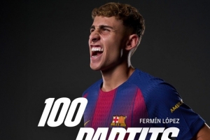 此役是费尔明的诺坎普首秀,也是他为巴萨出战的第100场比赛,巴萨官方社媒晒出海报,祝贺他达成巴萨百场里程碑。