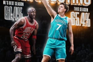 本赛季黄蜂4号秀克尼佩尔场均19.4分5.8篮板2.9助攻,三项命中率49.1、43.8、90%,真实命中率65.4%;乔丹生涯最佳单赛季真实命中率是61.4%。