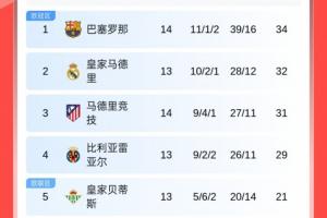 最新积分榜方面:先赛的巴萨凭借2分优势暂升榜首,排名第2的皇马明日凌晨将客战赫塔费,同样先赛的马竞积分反超黄潜暂时来到第3。