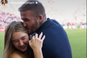 在夺冠现场,迈阿密国际老板贝克汉姆与家人一起庆祝夺冠,在维多利亚晒出的图中,贝克汉姆亲吻小七。