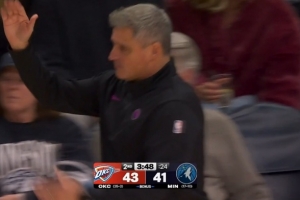 GIF-海兰德切球亚历山大被吹犯规,森林狼挑战成功,还拿到球权