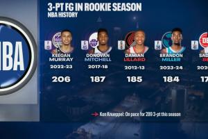 克尼佩尔今天生涯第29场比赛已命中100记三分,新秀历史最快!