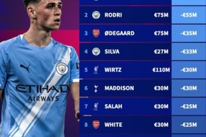 英超球员今年身价下跌榜:福登跌6000万欧、罗德里跌5500万欧前二