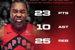 本场比赛巴恩斯17中11狂砍23分25篮板10助攻3抢断1盖帽,正负值+24。