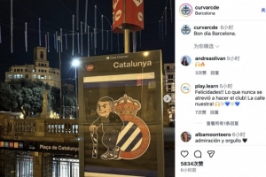 加泰德比氛围点燃,西班牙人球迷组织在巴塞罗那市街头张贴海报