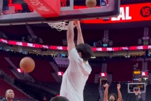 赛前,开拓者跟队记者@yovic晒出视频,杨瀚森与助教罗尼-伯勒尔连续对抗热身,篮下终结连续暴扣,勾手也连续命中。