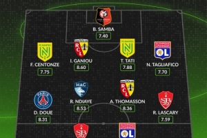 中场:杜埃(巴黎,8.31分)、拉索尔·恩迪亚耶(勒阿弗尔,8.53分)、阿德里安·托马森(朗斯,8.36分)、雷米·拉博·拉斯卡里(布雷斯特,7.59分)