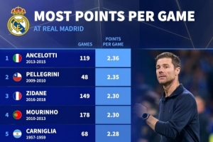 皇马主帅场均积分排名:安切洛蒂2.36分居首,阿隆索2.24分第七