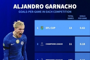 德国转会市场统计了加纳乔在各项赛事中的进球效率,他在联赛杯中场均打进0.62球,进球效率在他参加的赛事中最高。