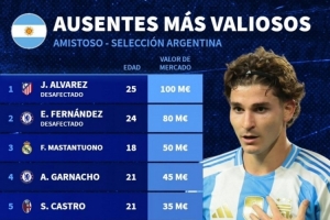 体育资讯11月12日讯 德国转会市场统计了缺席本期阿根廷队球员的身价,并列出榜单,阿尔瓦雷斯1亿欧居首,恩佐-费尔南德斯8000万欧次席。